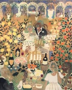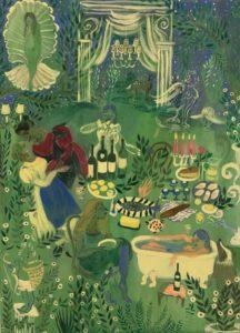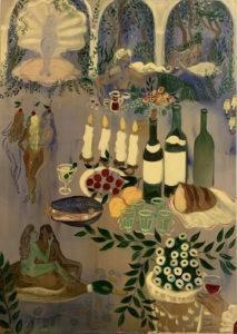 6-What influences you as an artist? I’d say my work is pretty narrative, but I like to sort of combine and flatten stories. I get a lot of my influences from books, stories, the movie Fantasia, Greek Mythology, other artists. I have been really drawn to Surrealism and female surrealist artists, for example Leonora Carrington, Remedios Varos. And also Hieronymous Bosch (I would call him a surrealist at heart) Dali, Frida Kahlo, and Paul Delvaux. I am in love with Florine Stettheimer, who was good friends with Marcel Duchamp. I also look at a lot of food images, particularly Laila Gohar and I love the Les Diner de Gala by Dali (Dali’s Surrealist Cookbook).