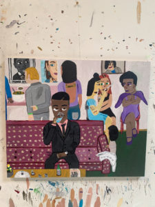 7- Is there any reality behind the characters in your paintings or are they purely fantasy?  It’s a little bit of both. The characters are based on people in my life: ex-girlfriends, muses, close friends, and family (especially my dad because I’m very close with him). The situations that they are in, the band shirts that they have on, the books they are reading, and the posters on their walls are very much fantasy and are details that I decided to add to the scene.