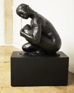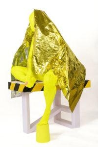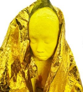 8-You have a yellow self-sculpture “The Yellow Looking Glass” can you explain why yellow and why covered with a thermal blanket? The Yellow Looking Glass was my first ink body sculpture. Of the four of myself that I’ve completed so far, it is the closest to a self-portrait. There are several features that speak to my personal experience with race, being of immigrants, female parts, trauma and spirituality. The color yellow can be contentious regarding Asian people because it has been used as a slur. A pink toe recalls a birth mark. Three micro-fans are inserted on the back so that the ink body itself becomes an exhaust. The circulating air flutters the thermal foil blanket to suggest that the ink body is vibrating and alive. After all, the ink material is organic – alive – and must stay cool and dry. It expresses a self-proclaimed state whether it be in vulnerability, transition or acceptance.