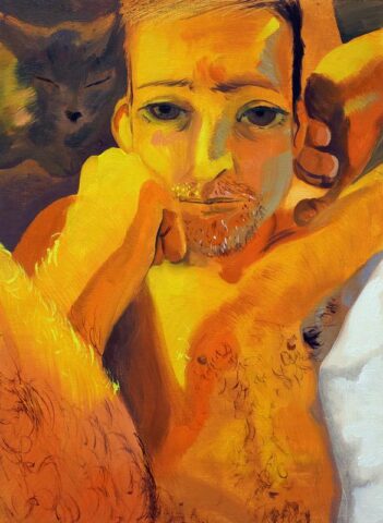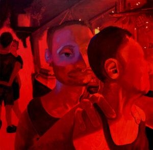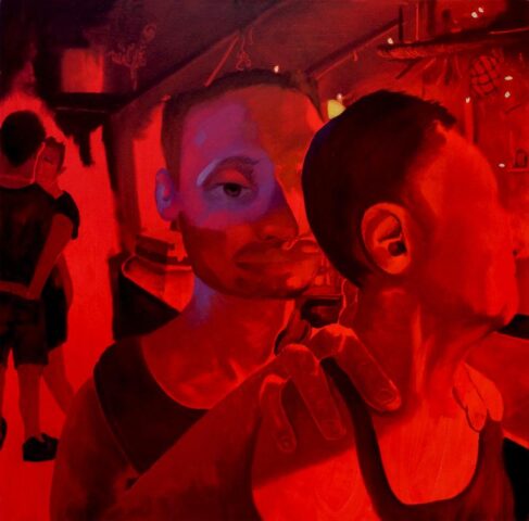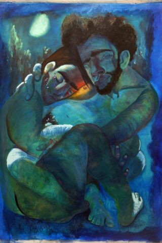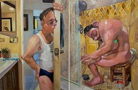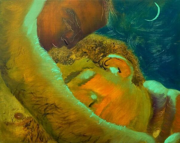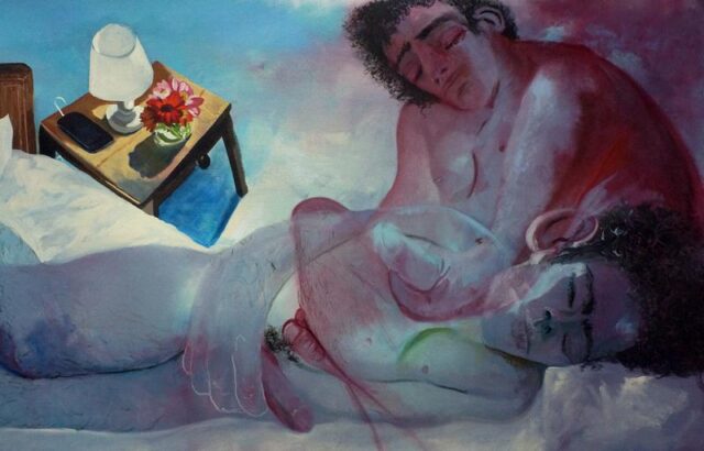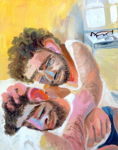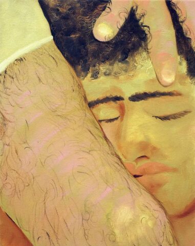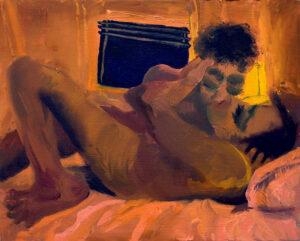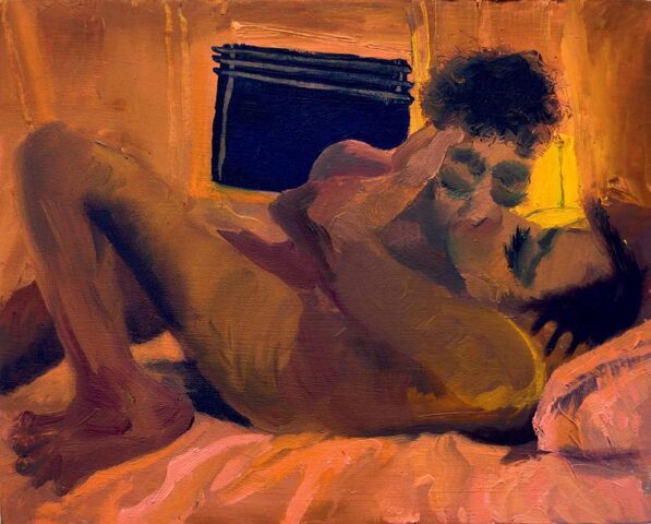 Are there personal or emotional chapters of your life that you feel compelled to explore through painting? Yes, “The Fever,” a diptych, depicts a seminal moment in my life, a moment of crisis but also profound connection. I was very sick, and as I was trying to shower, I saw my partner looking in on me quietly. The way he comforted me through proximity in that moment, when I was completely vulnerable, made me feel safe for the first time in a long time. It was an essential chapter to explore.