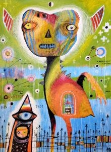4-Your work is very unique in nature, What is the inception of your work? I think many of my ideas percolate in the back of my mind as I go about my day. I'm a very visual person, so as I'm out and about, I often see inanimate objects that make me think of a character or scene. I see rocks with faces, faces in trees, weird mechanical, electrical or water fixtures, graffiti, who knows! Sometimes, before I fall asleep, I see images floating by, things I might paint or draw the next morning. Sometimes it's a specific creature, sometimes I see a certain color combination, and sometimes it's totally random.