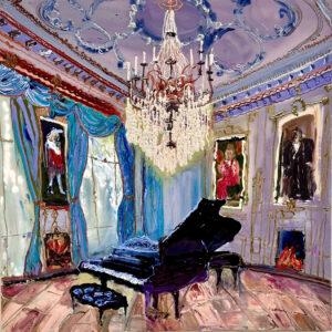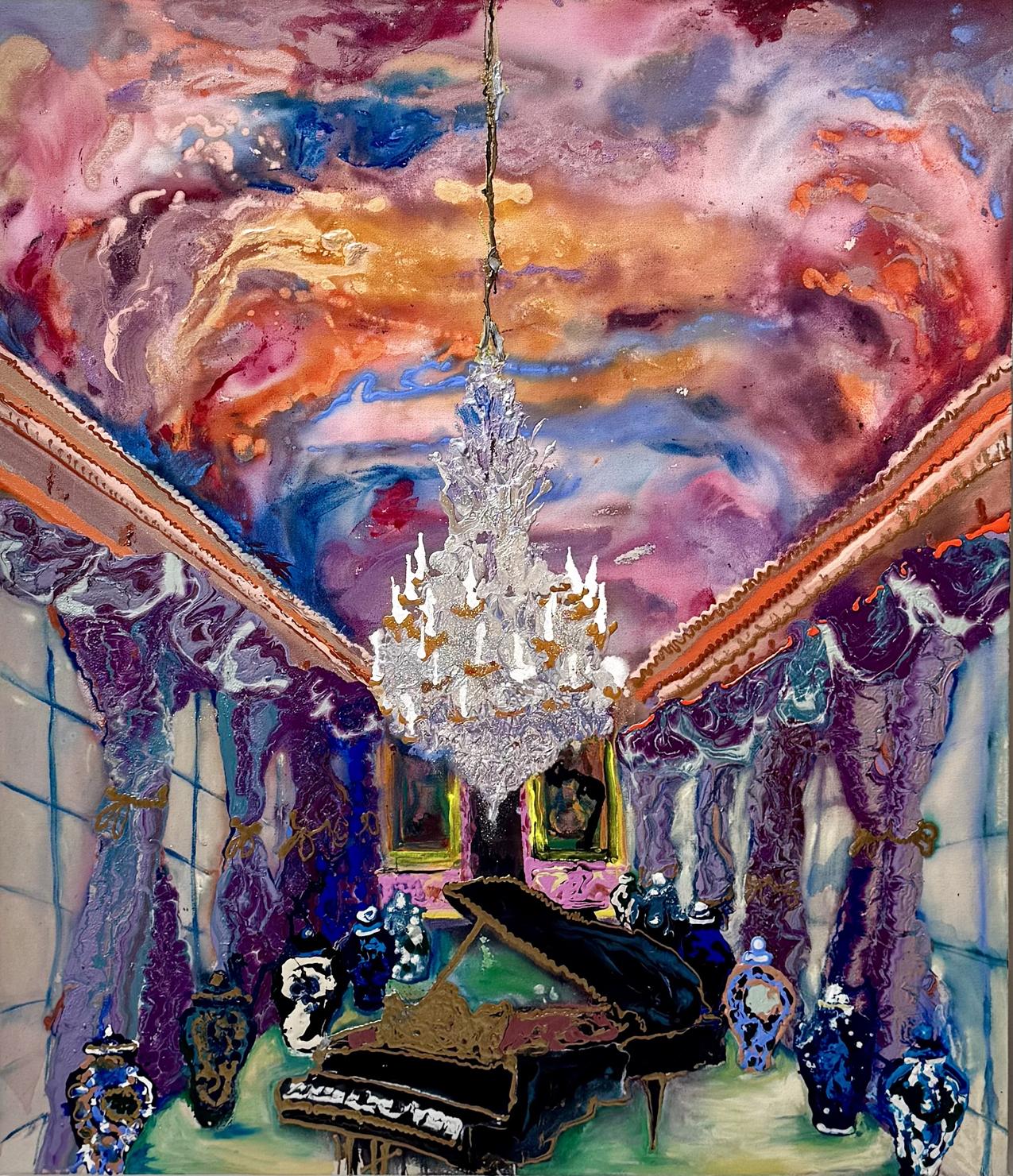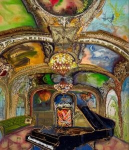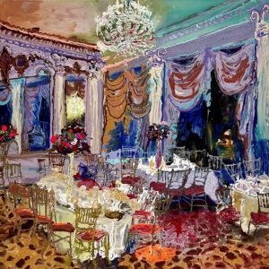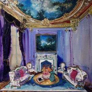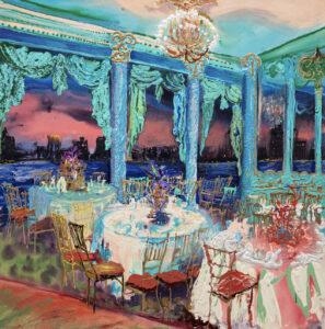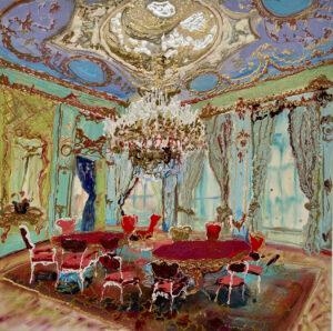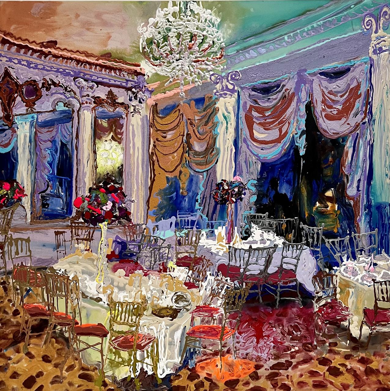 I perceive my career as divided into three sections so far. From 1970 through 1990, I worked in wet-on-wet acrylic with mostly urban landscapes and interiors. From 1990 to 2020, I worked in oil with urban ruins and junkyards, chandeliers, gardens, and occasional pastoral landscapes. When I returned to acrylic in 2020, it felt like a dam breaking. I simply couldn’t make oil paint do what I wanted it to do. It was during the pandemic, and I focused on picture-perfect travel images juxtaposed with foreground still-life objects. More recently, reception halls and castle rooms have become fertile ground. Place with all its complexity—has been the consistent theme throughout.