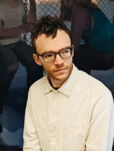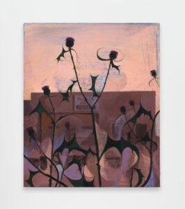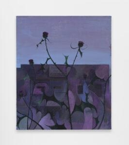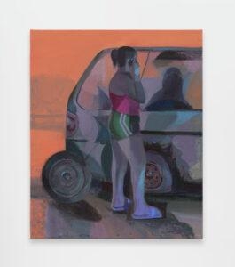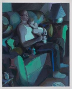 4. Your paintings often feature vivid colors like midnight blues and hot pinks. How do you use color to convey the emotional tone of your subjects?  Color resists one-to-one translations for me, which is why I enjoy it so much. When I’m thinking about a painting, I might choose a color palette because it makes me think of a time of day or time of year, and it is connected with the quality of light (daylight in summer or TV glow at midnight). In others, there might be an object—a hi-vis worker’s vest, for instance—that decides the palette. In almost every case, the palette of my paintings evolves over the course of the painting. I begin my canvases with a fairly abstract process of smearing and moving color around (as opposed to drawing out an image and developing it). The results are often unexpected. I read once that Goethe would push on his eye to try to see prismatic effects of color. Good painting can be like a poke in the eye. Color and light can be such a shock to me, a jolt, a disruption to the everyday. These ruptures are often central to the experience of looking at my work—for me first. Rather than planning the color, I’m looking for these moments where I feel like some third hand has catalyzed the picture, vivifying the experience.
