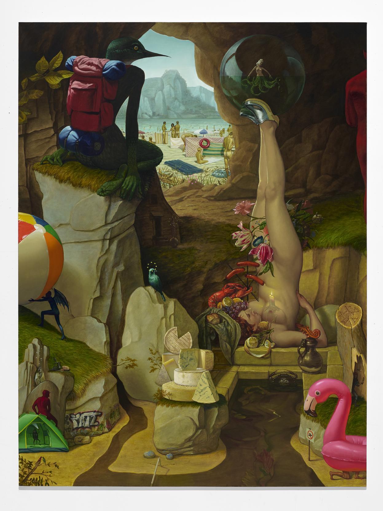 6.Your work often juxtaposes the intricacy of Dutch Masters and Vanitas painting with contemporary, often cartoonish, surreal elements. What led you to this specific blend of high and low culture? I’m just responding in the way I see and think. Things seem to be wide open at the moment. There are no over-.arching “isms” dictating how to think about or construct meaning. If there is an “ism” that dominates today’s artistic discourse it would have to be pluralism. More specifically, an effort to build upon, remix or mash-up in order to subvert or reorder the original intent or meaning of something. This can be seen in full display in internet meme culture; where an image or video circulates like a snowball rolling downhill growing in complexity as users add layer upon layer of meaning to it. It not only changes in size and shape, but the internal structure of the image itself - morphing in humorously ingenious ways. I think this is the current state of the creative mind. This is how society constructs meaning at the moment.