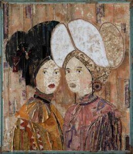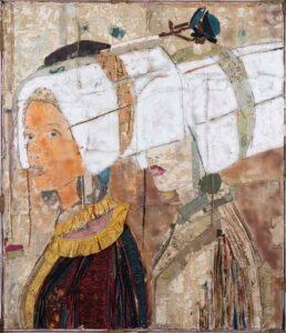 6. Your collages use fabrics, handmade papers, and found materials from places like India and Indonesia. What draws you to these textiles and textures, and how do you decide when a material “belongs” in a piece?
