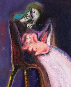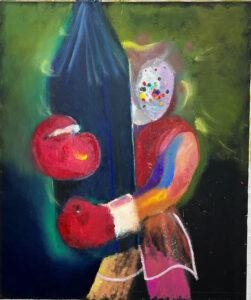 12. Do you see your work as narrative or more psychological?  Both. There are recurring themes—a seated figure, a boxer, a particular palette, apples, frogs. The repetition becomes narrative, and that narrative becomes psychological, filtered through my mental and physical state.